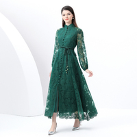 JEFFERYエレガントなスタンドアップカラーヘビーワーク刺繍ランタンスリーブレースアップウエストスイングロングドレス